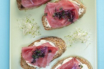 Тосты с креветками и огуречным соусом