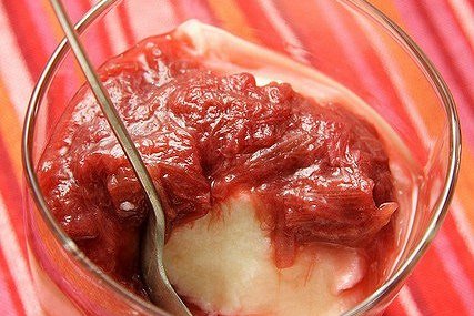 Манный пудинг с теплым компотом из ревеня