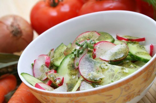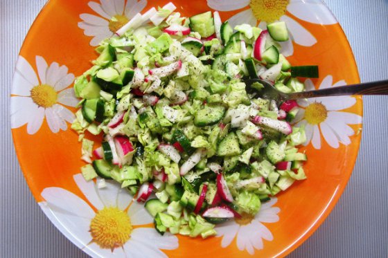 Салат из молодой капусты, редиски и огурцов